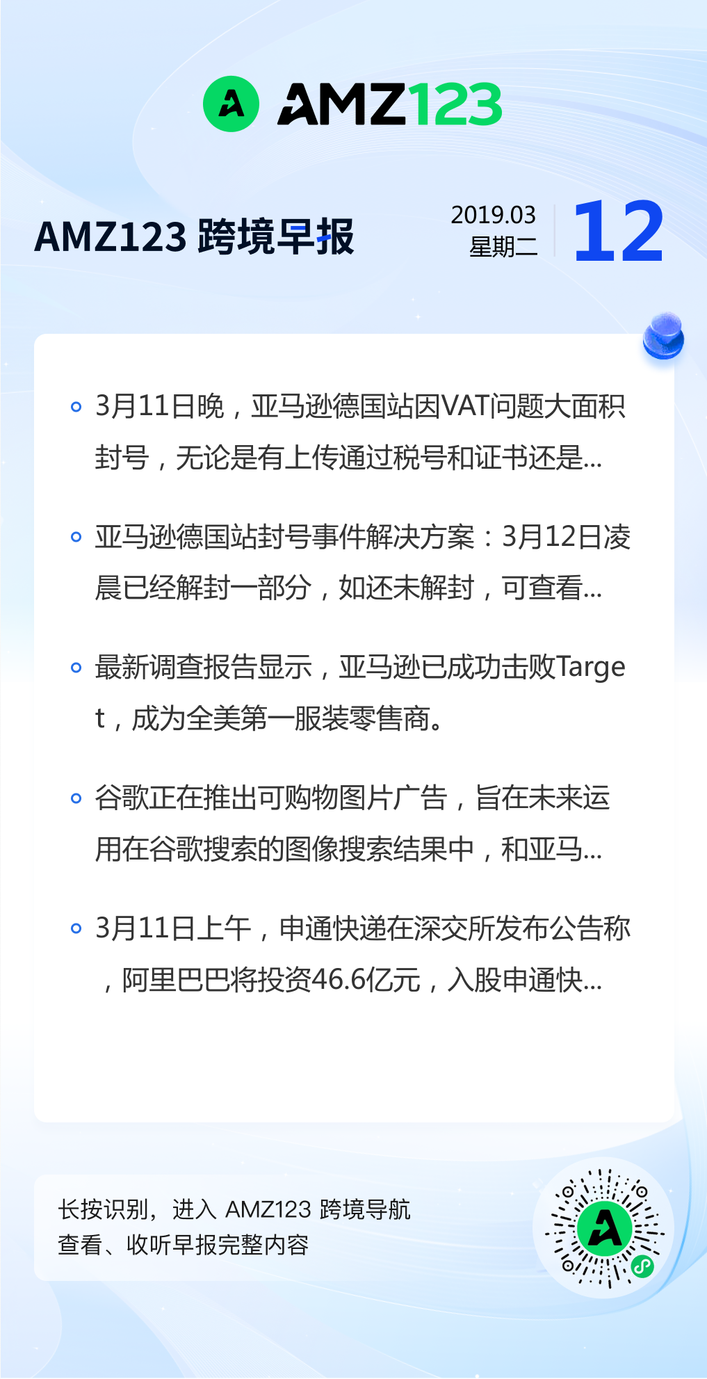 亚马逊德国站封号事件解决方案:3月12日凌晨已经解封一部分,如还未解封,可查看下方链接操作:http://t.cn/EMSyyFz3.3月8日起,Wish物流EPC新增法国测试路向,商户交货到仓时间从之前的120小时延长至168小时。
