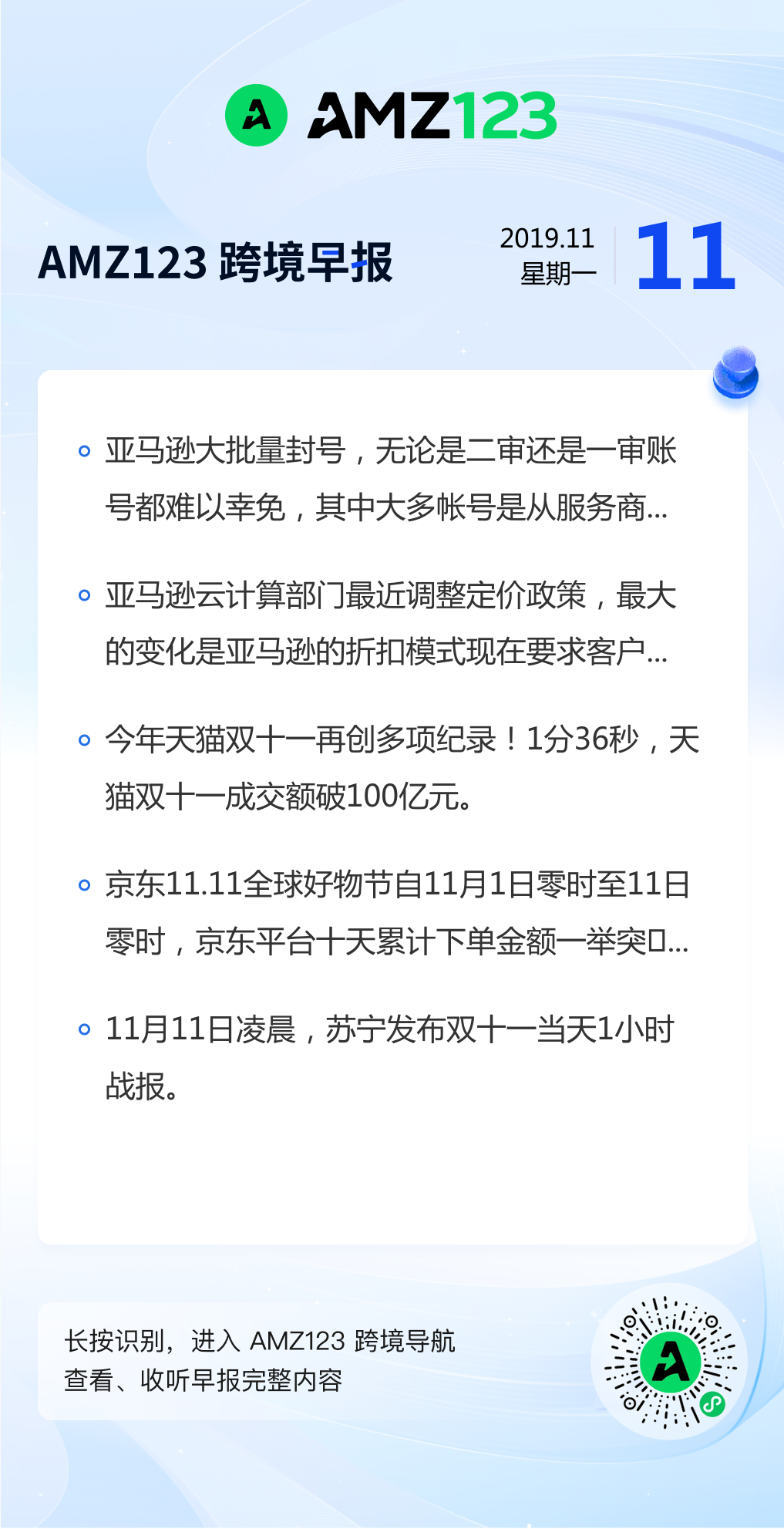 查看更多 2019年11月11号跨境早报