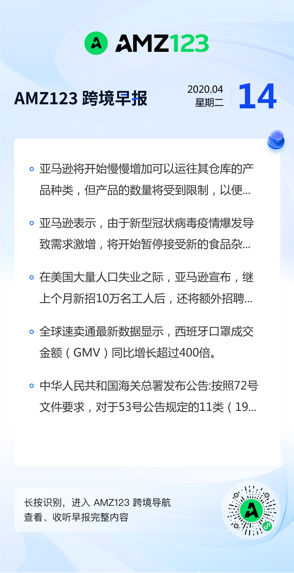 在美国大量人口失业之际,亚马逊宣布,继上个月新招10万名工人后,还将额外招聘7.5万人。