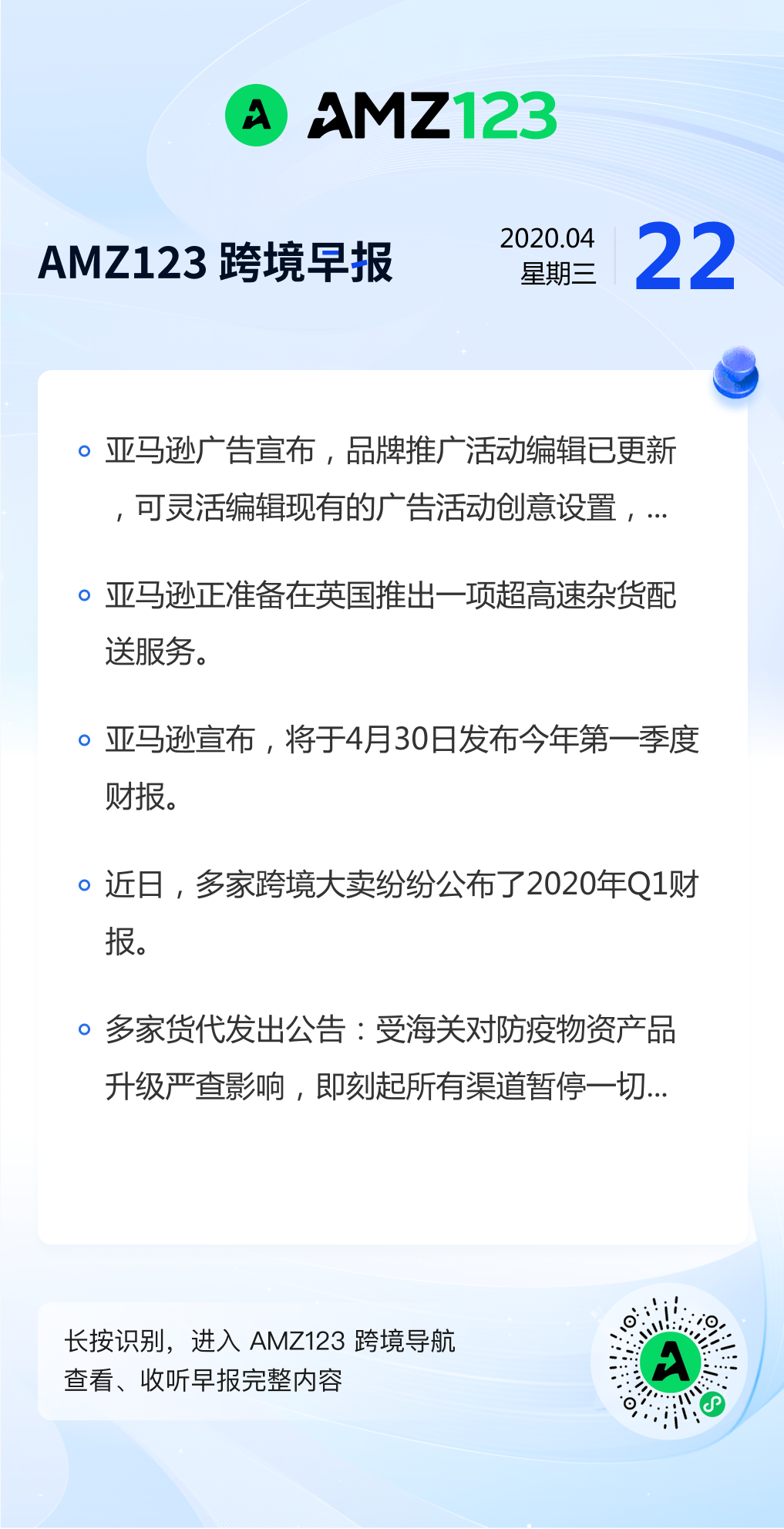 亚马逊宣布,将于4月30日发布今年第一季度财报。