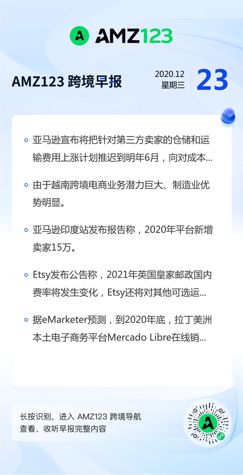 亚马逊宣布将把针对第三方卖家的仓储和运输费用上涨计划推迟到明年6月,向对成本上涨感到不满的商家示好。