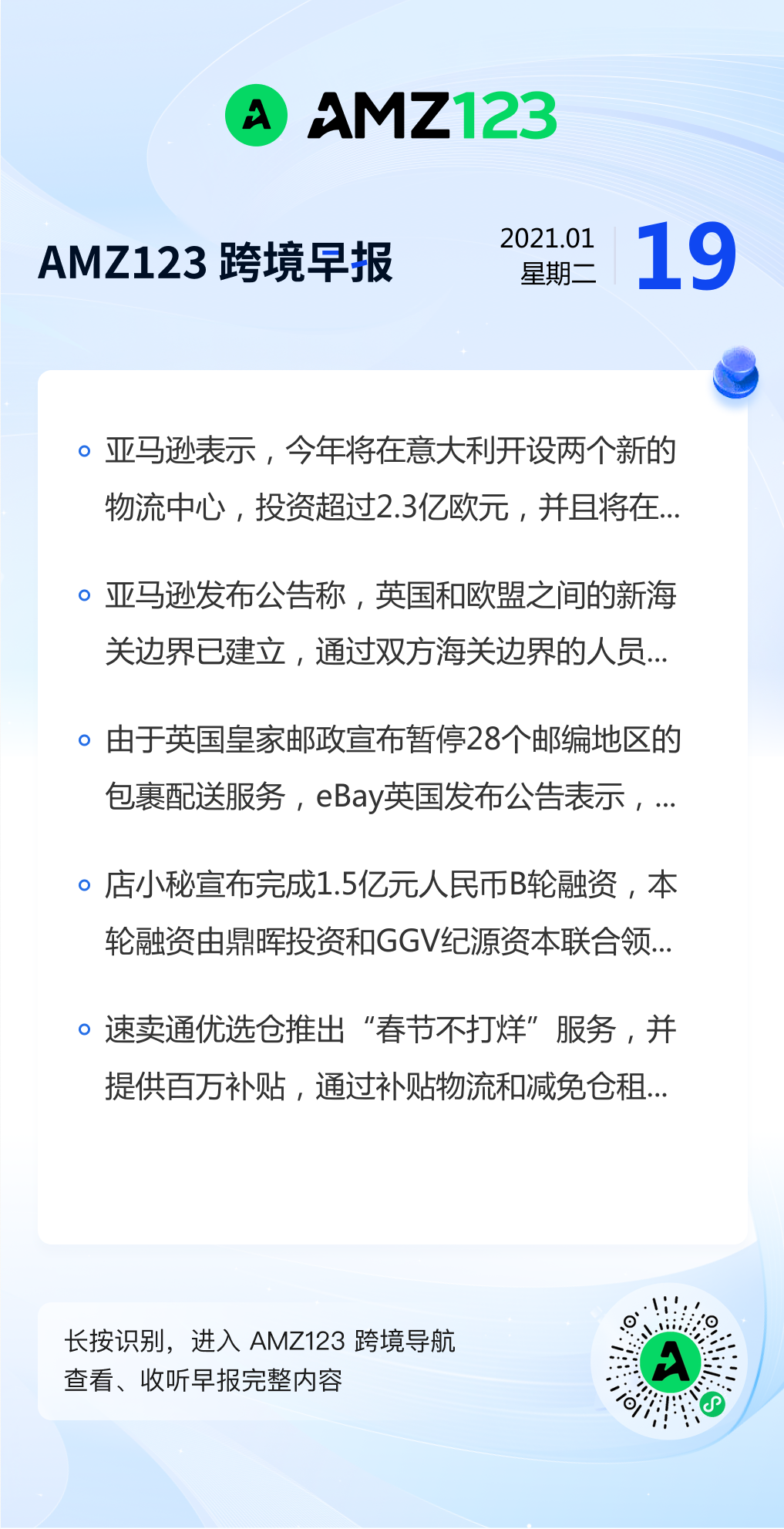 亚马逊发布公告称,英国和欧盟之间的新海关边界已建立,通过双方海关边界的人员和货物可能会受到额外检查。