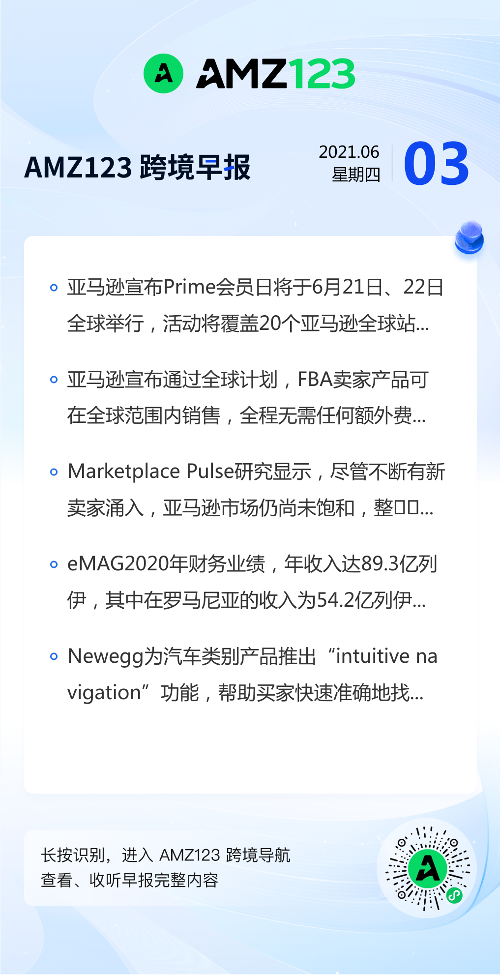 亚马逊宣布Prime会员日将于6月21日、22日全球举行,活动将覆盖20个亚马逊全球站点。