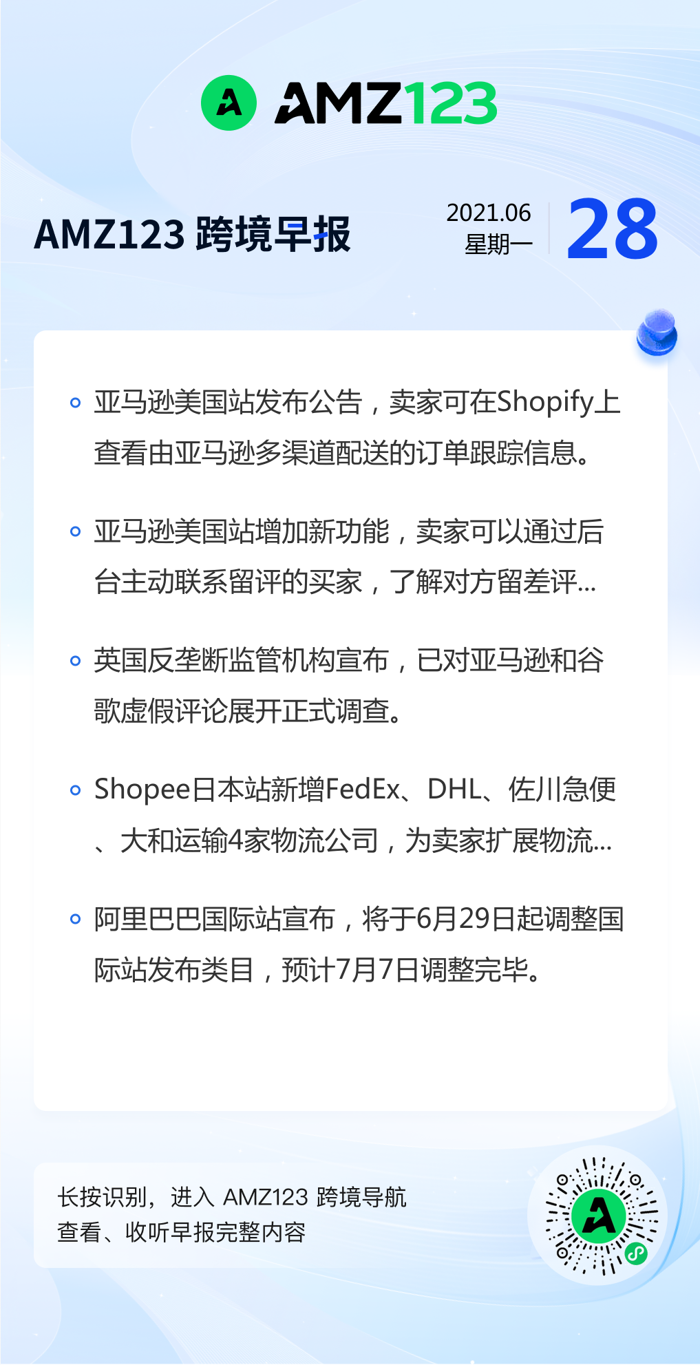 亚马逊美国站发布公告,卖家可在Shopify上查看由亚马逊多渠道配送的订单跟踪信息。