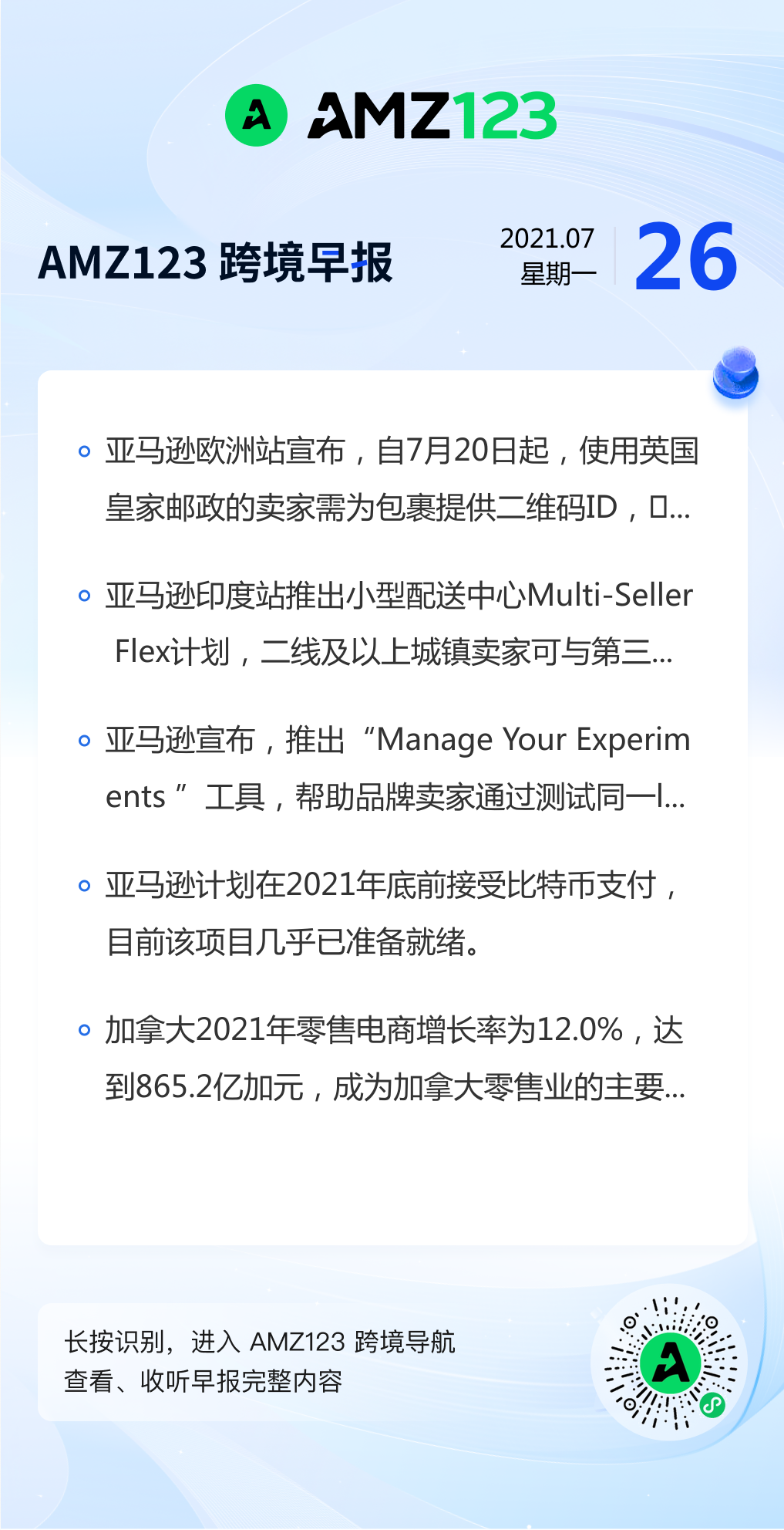 亚马逊欧洲站宣布,自7月20日起,使用英国皇家邮政的卖家需为包裹提供二维码ID,若8月8日前未提供二维码ID,VTR将会出现下降。