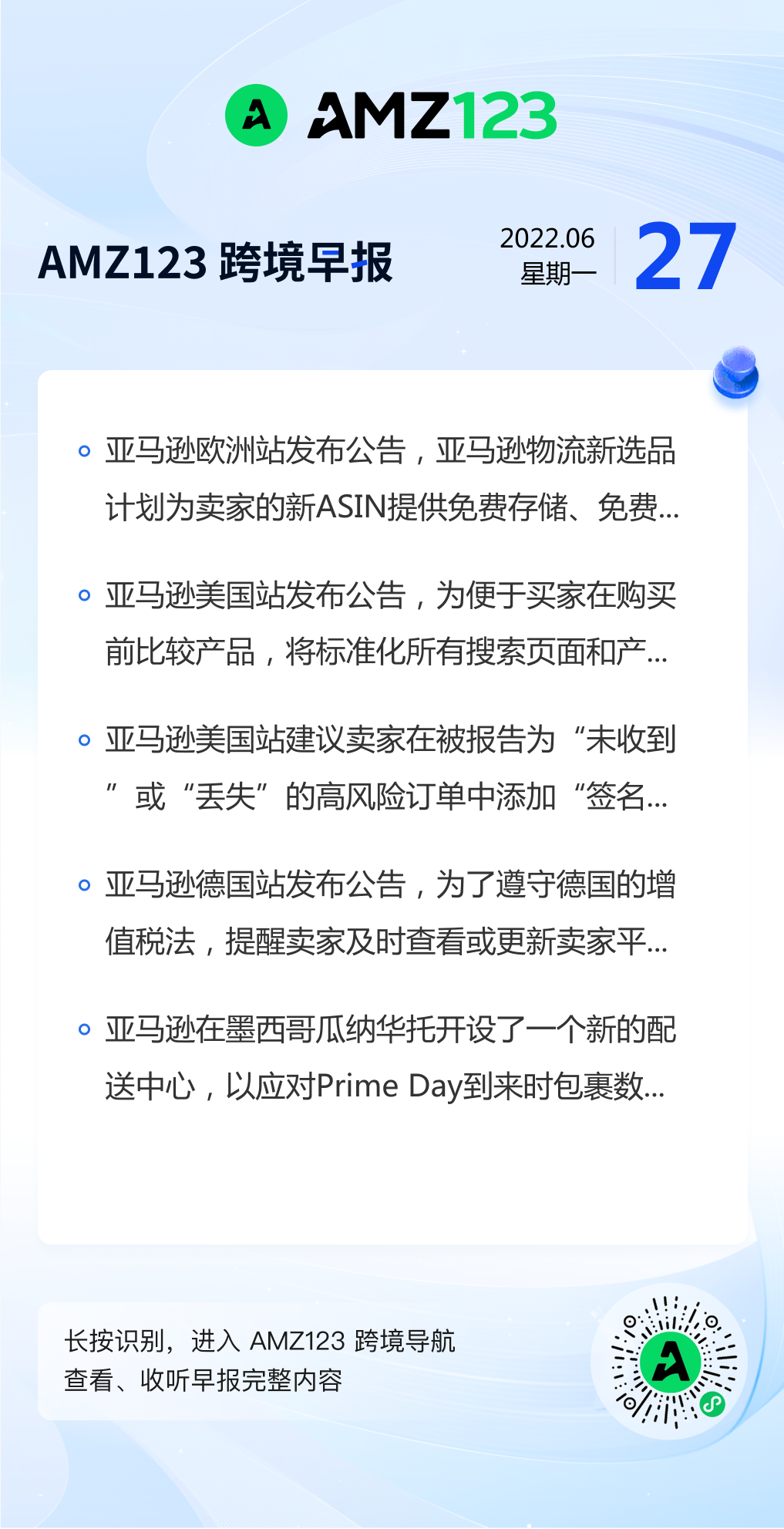 亚马逊欧洲站发布公告,亚马逊物流新选品计划为卖家的新ASIN提供免费存储、免费移除和免费退货处理福利,便于卖家上架产品的同时又降低运营成本。