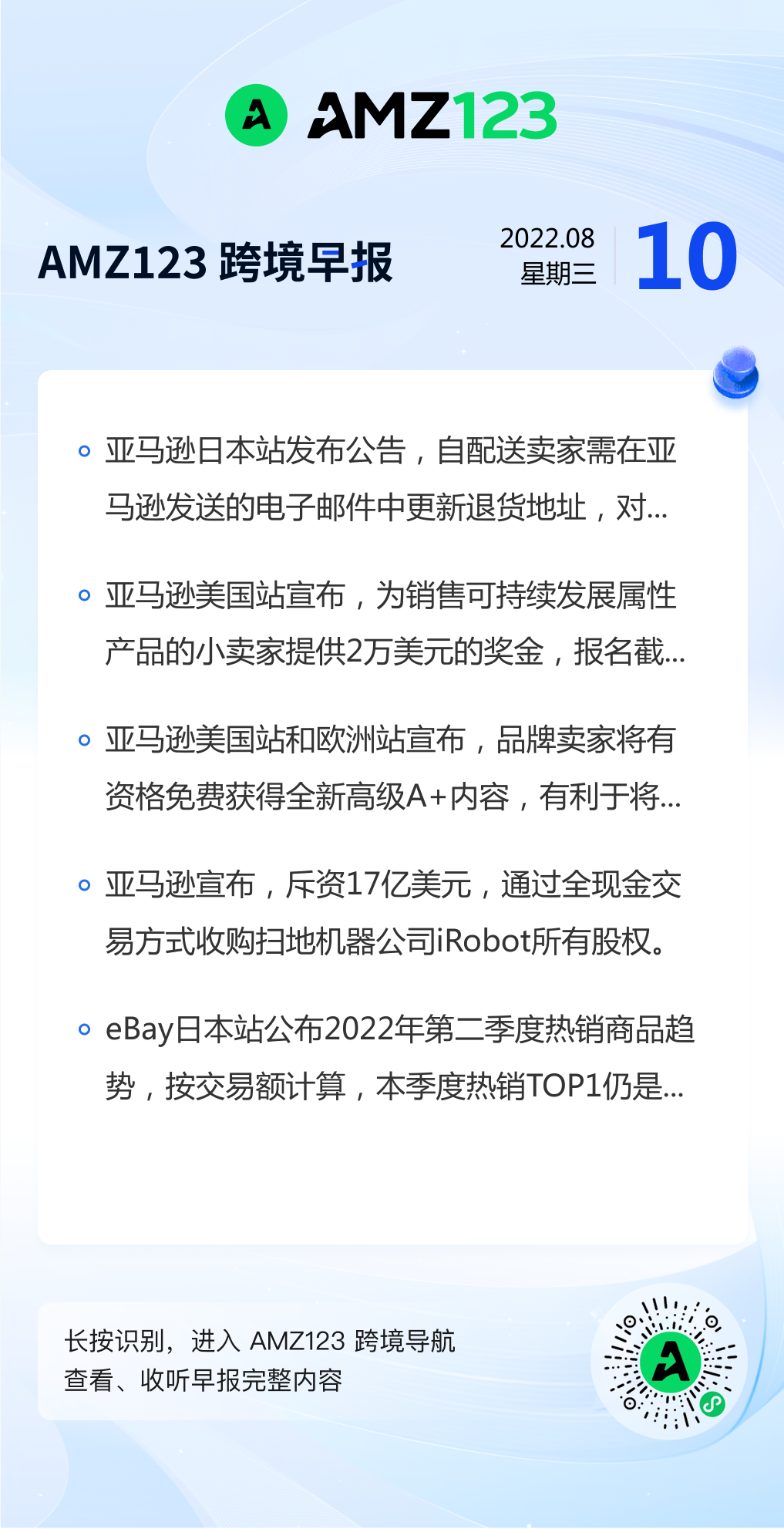 亚马逊美国站宣布,为销售可持续发展属性产品的小卖家提供2万美元的奖金,报名截止时间为8月18日,获奖产品将在多家亚马逊商店中提供产品展示的机会。