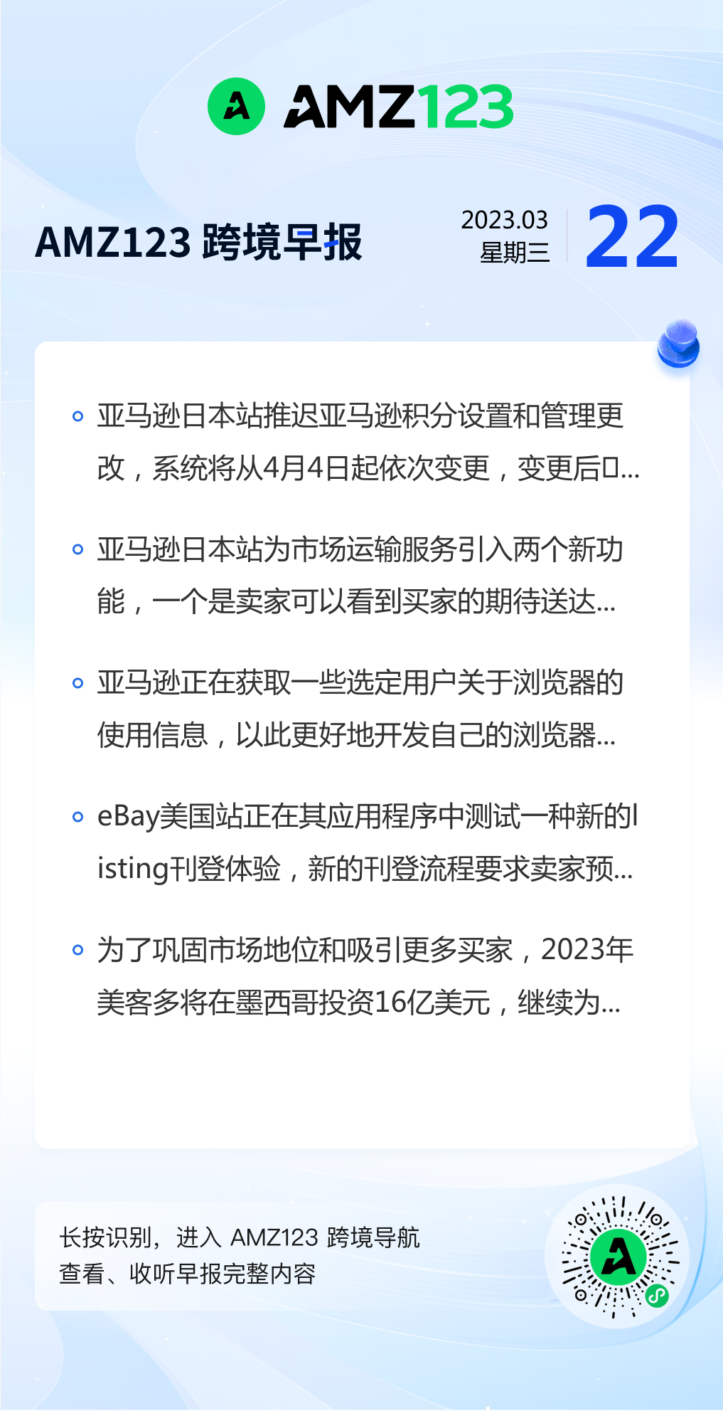 AMZ123获悉,亚马逊日本站发布公告称为了顺利运营定于2023年3月31日至4月2日举行的限时促销节,亚马逊推迟了亚马逊积分设置和管理的更改,系统将从4月4日起依次变更,变更后的Point Central"每个账户的积分%"将自动应用于新注册的listing,以下是公告内容:亚马逊一直致力于让卖家更轻松地设置和管理亚马逊积分。