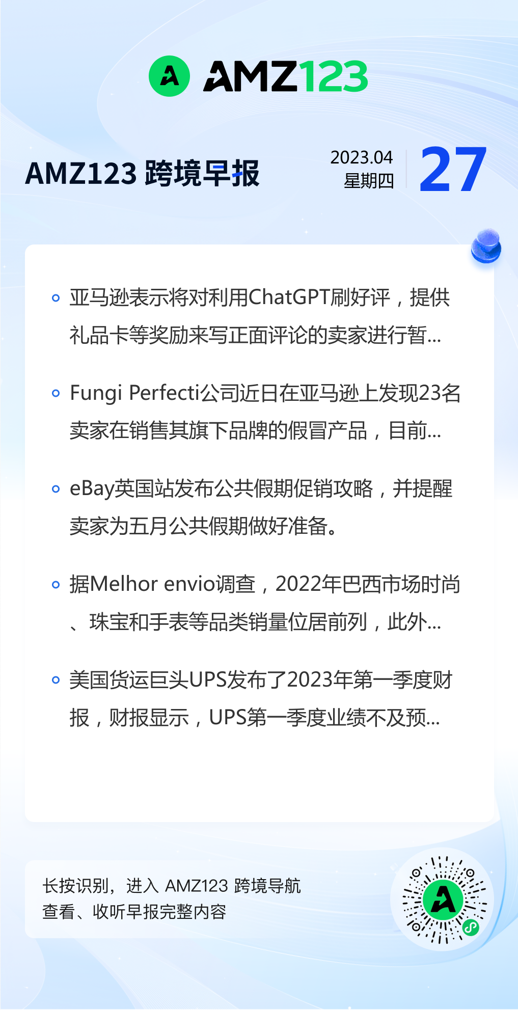 查看更多 2023年4月27号跨境早报