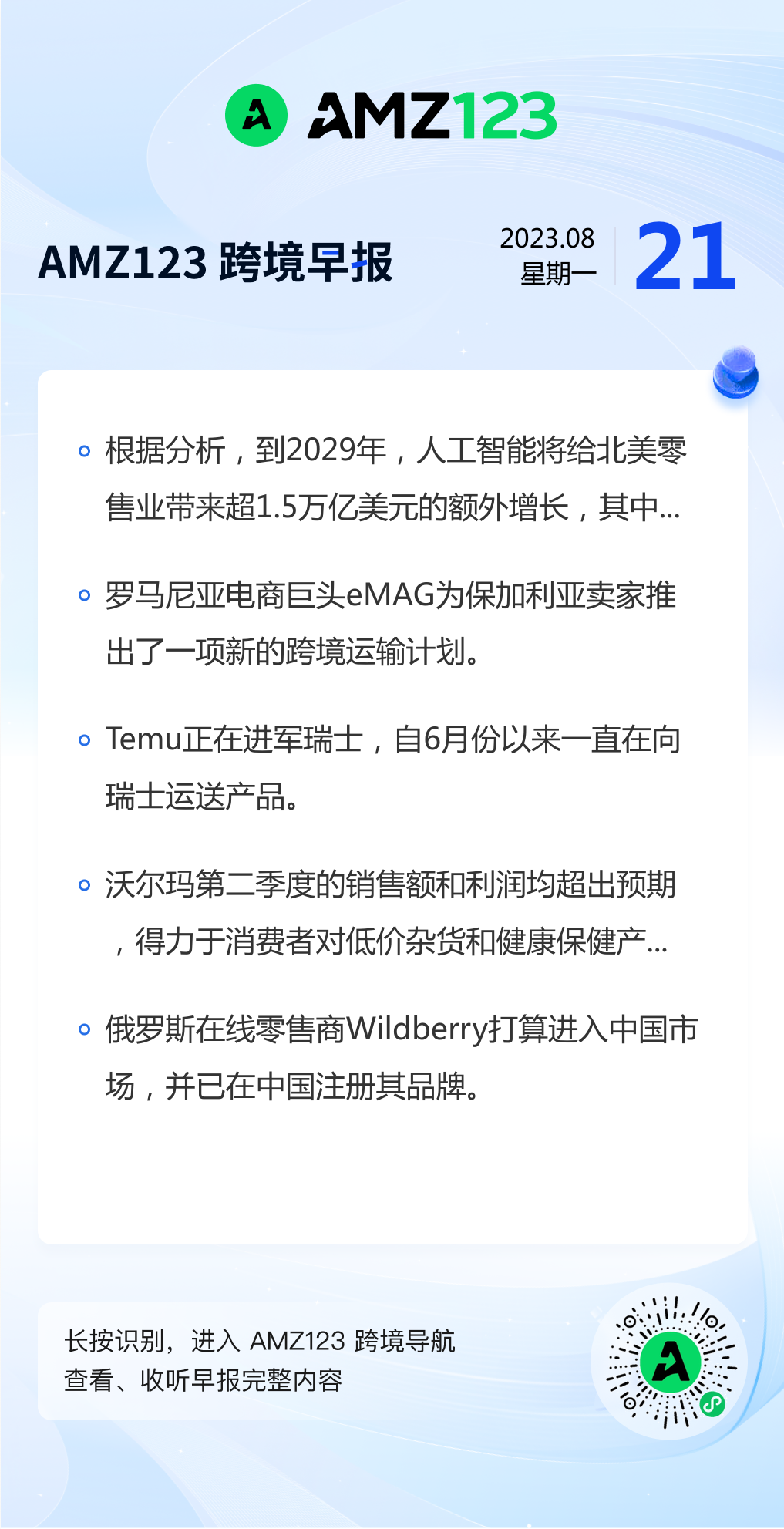 AMZ123获悉,根据分析公司IHL Group最新发布的《零售人工智能就绪指数》(Retail AI Readiness Index),到2029年,人工智能将给批发北美零售业带来超1.5万亿美元的额外增长。其中,亚马逊和沃尔玛预计将获得超过5800亿美元,占总额的38.5%。