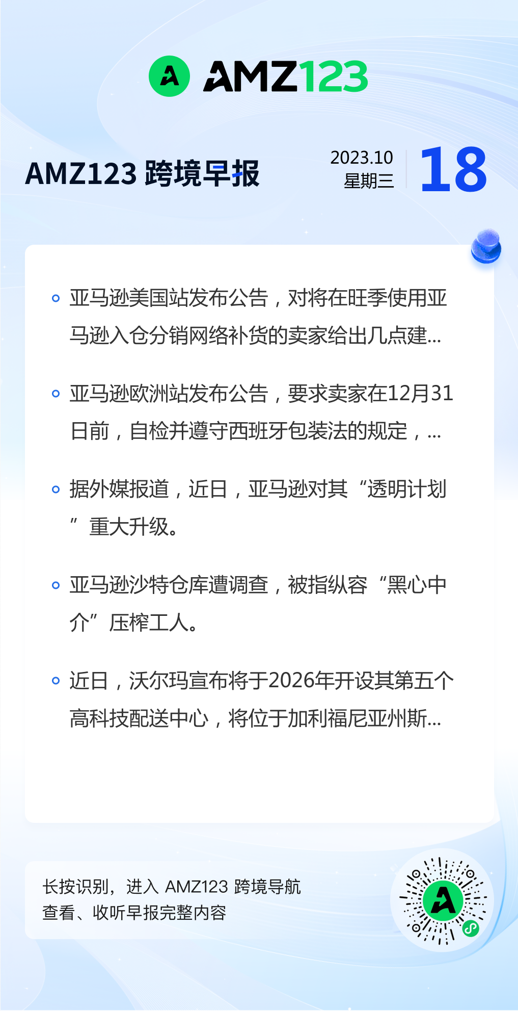 AMZ123获悉,自2022年6月,沃尔玛宣布将开设四个高科技配送中心的计划后,近日,沃尔玛宣布将于2026年开设其第五个高科技配送中心。该配送中心将位于加利福尼亚州斯托克顿,面积达90万平方英尺,采用高度自动化仓储、分拣系统。