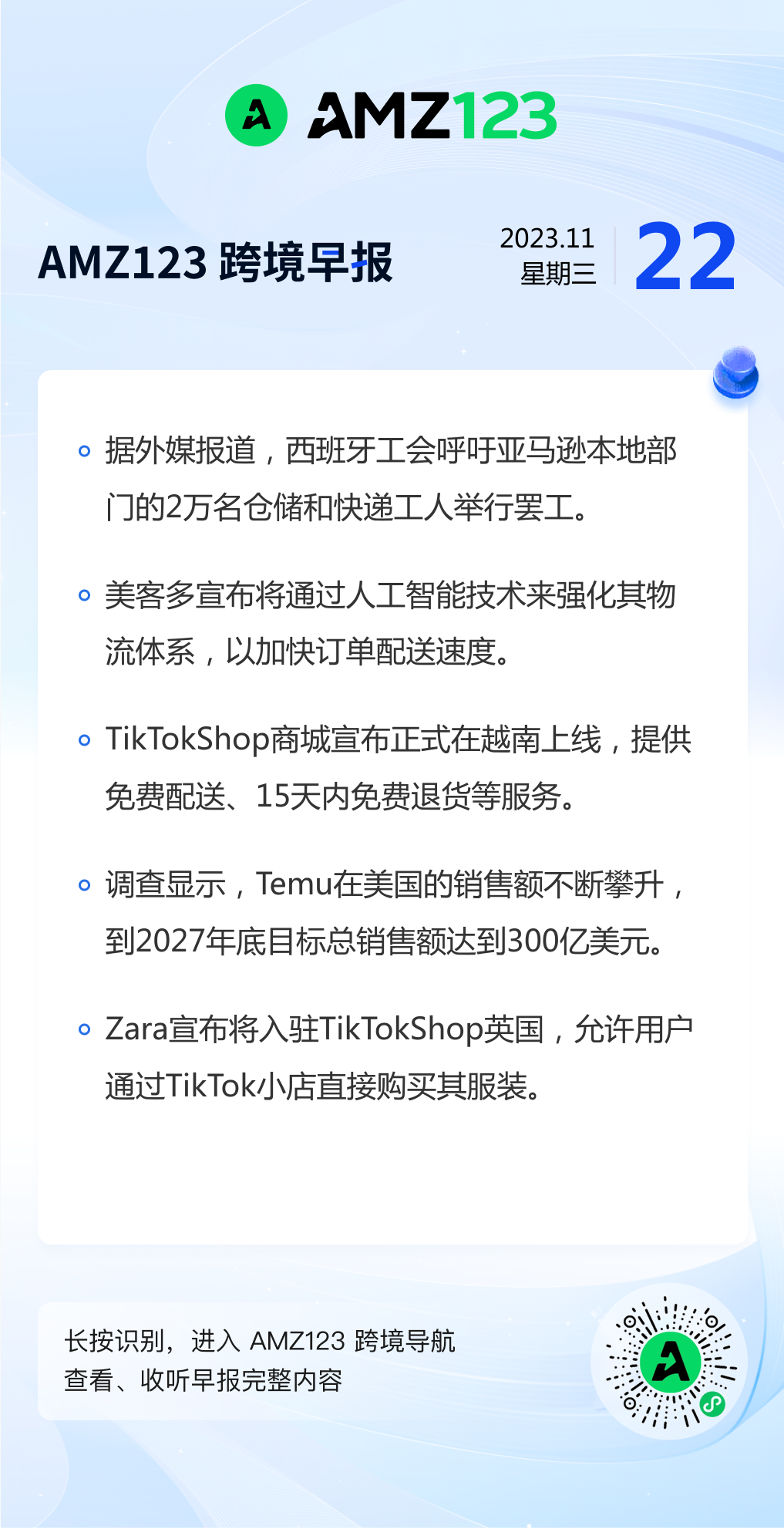 AMZ123获悉,11月20日,TikTokShop商城宣布正式在越南上线,商城内商品将确保100%正品,同时提供免费配送、15天内免费退货等服务。据悉,TikTokShop商城内集中了美妆、时尚、电子等多个品类的国内外品牌商、卖家以及代理商。 事实上,早在去年10月,TikTokShop的商城模式就已经在印尼市场开始测试。