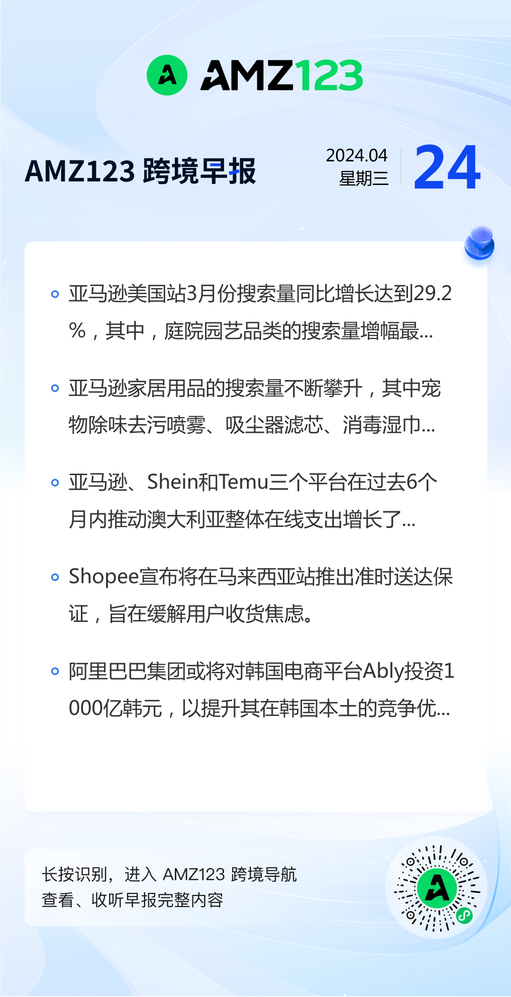 AMZ123获悉,4月22日,Momentum Commerce发布了最新数据,2024年3月,亚马逊美国站搜索量同比增长达到29.2%,超过了上个月26.6%的增幅。据了解,在季节性类别中,2024年的表现较2023年更为强劲,越来越多美国消费者转向亚马逊进行季节性购物。其中,庭院园艺品类的搜索量增幅最大,达到49.9%。
