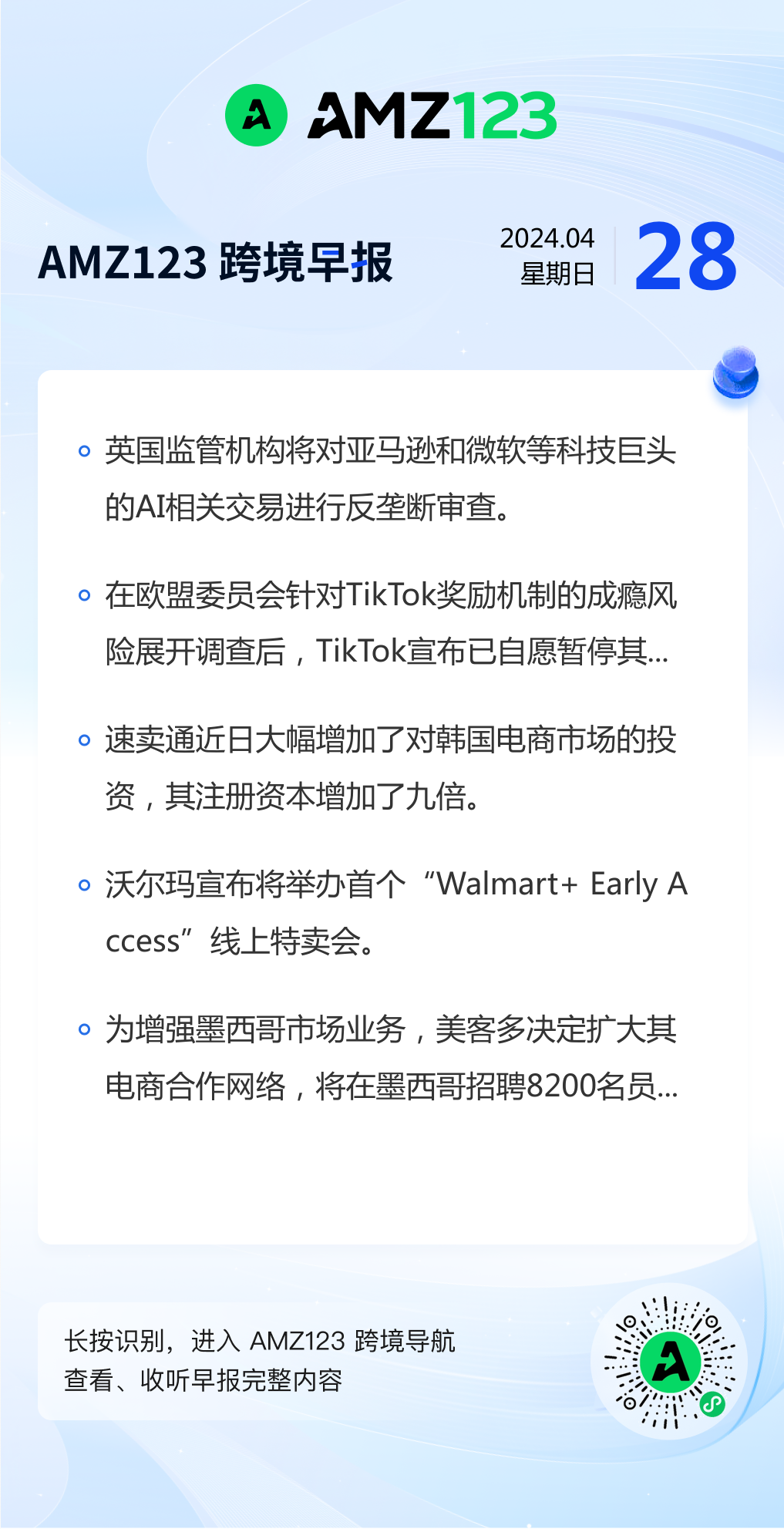 AMZ123获悉,4月25日,据外媒报道,为加快缩小与亚马逊电商业务的差距,沃尔玛宣布将举办首个“Walmart+ Early Access”线上特卖会,为其Walmart+会员提供抢先购买限量版和独家商品的福利。据了解,活动将于4月29日中午在沃尔玛在线商城开放24小时。除食品杂货外,Walmart+会员还可以购买服装、电器和健康保健等类别的产品,并且均可享受免费送货服务。