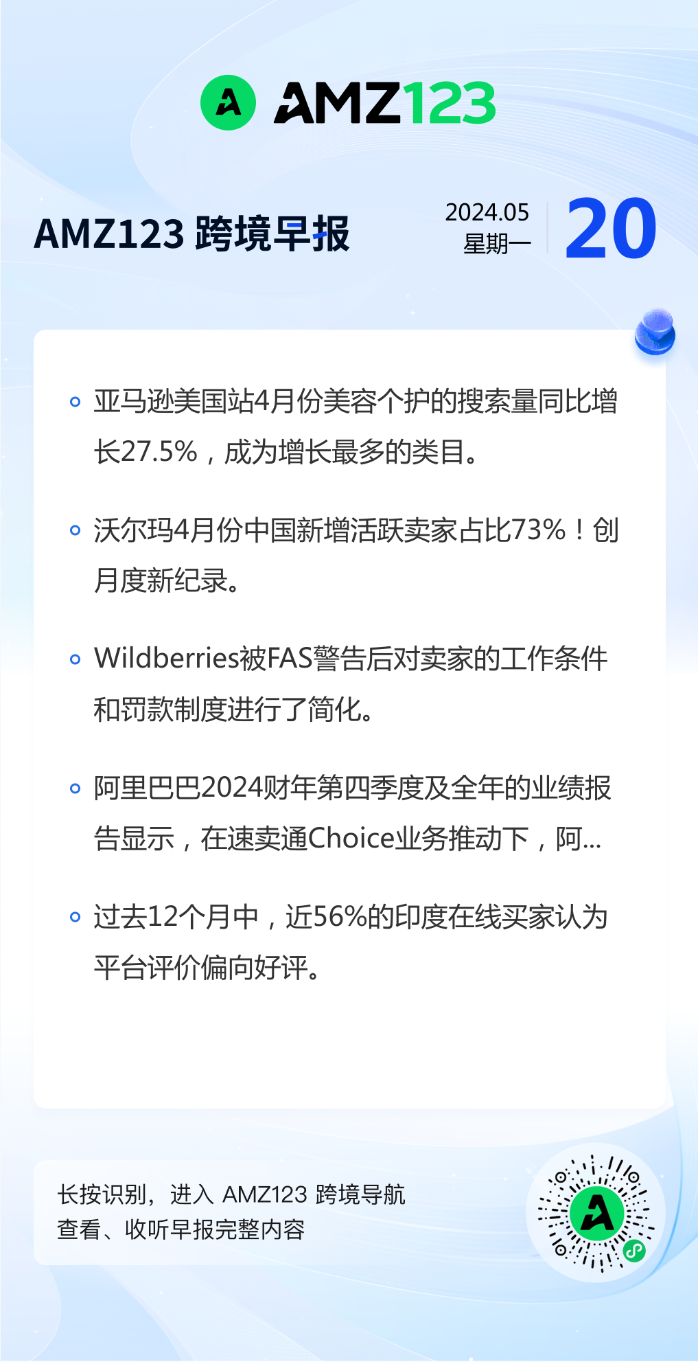 亚马逊美国站4月份美容个护的搜索量同比增长27.5%,成为增长最多的类目。