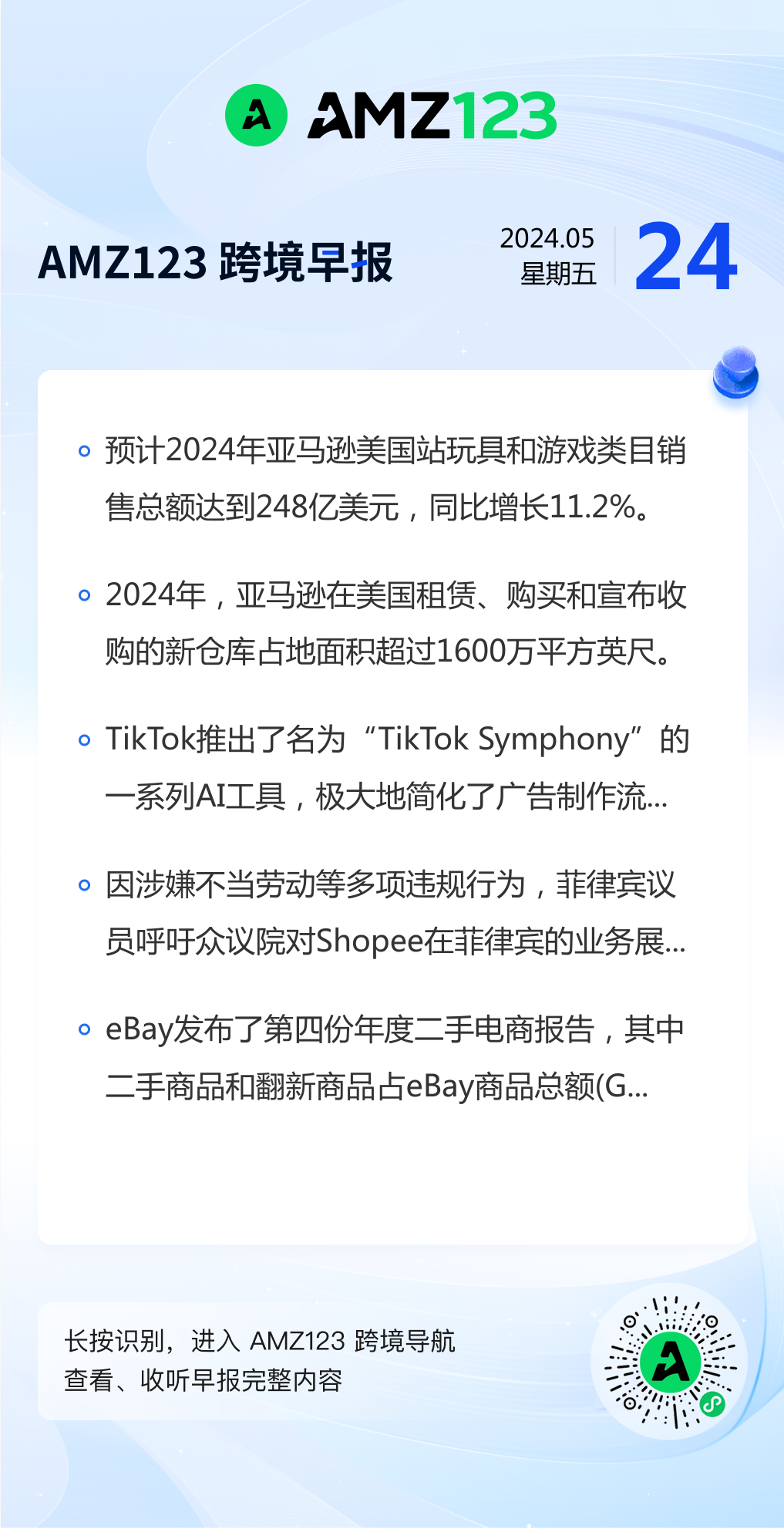 预计2024年亚马逊美国站玩具和游戏类目销售总额达到248亿美元,同比增长11.2%。