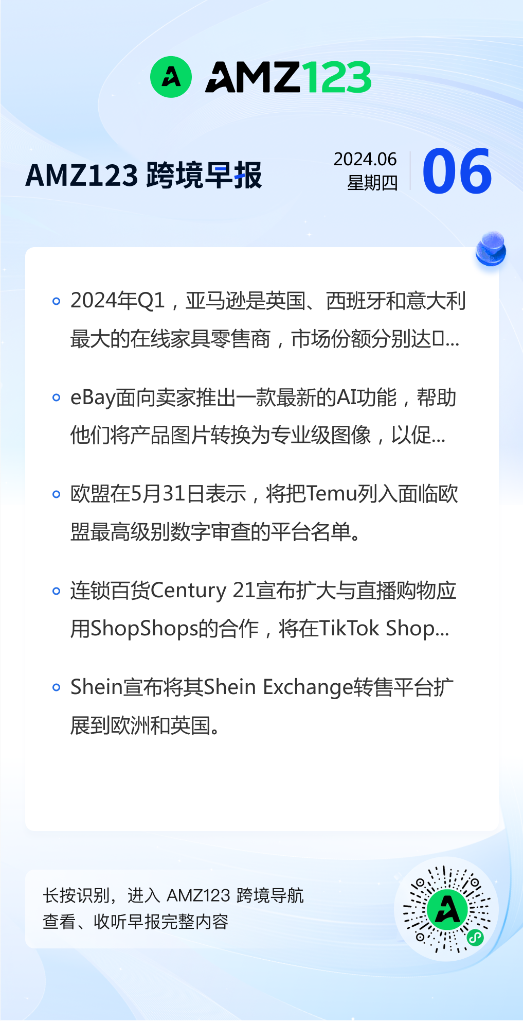 2024年Q1,亚马逊是英国、西班牙和意大利最大的在线家具零售商,市场份额分别达到26%、45%和24%。