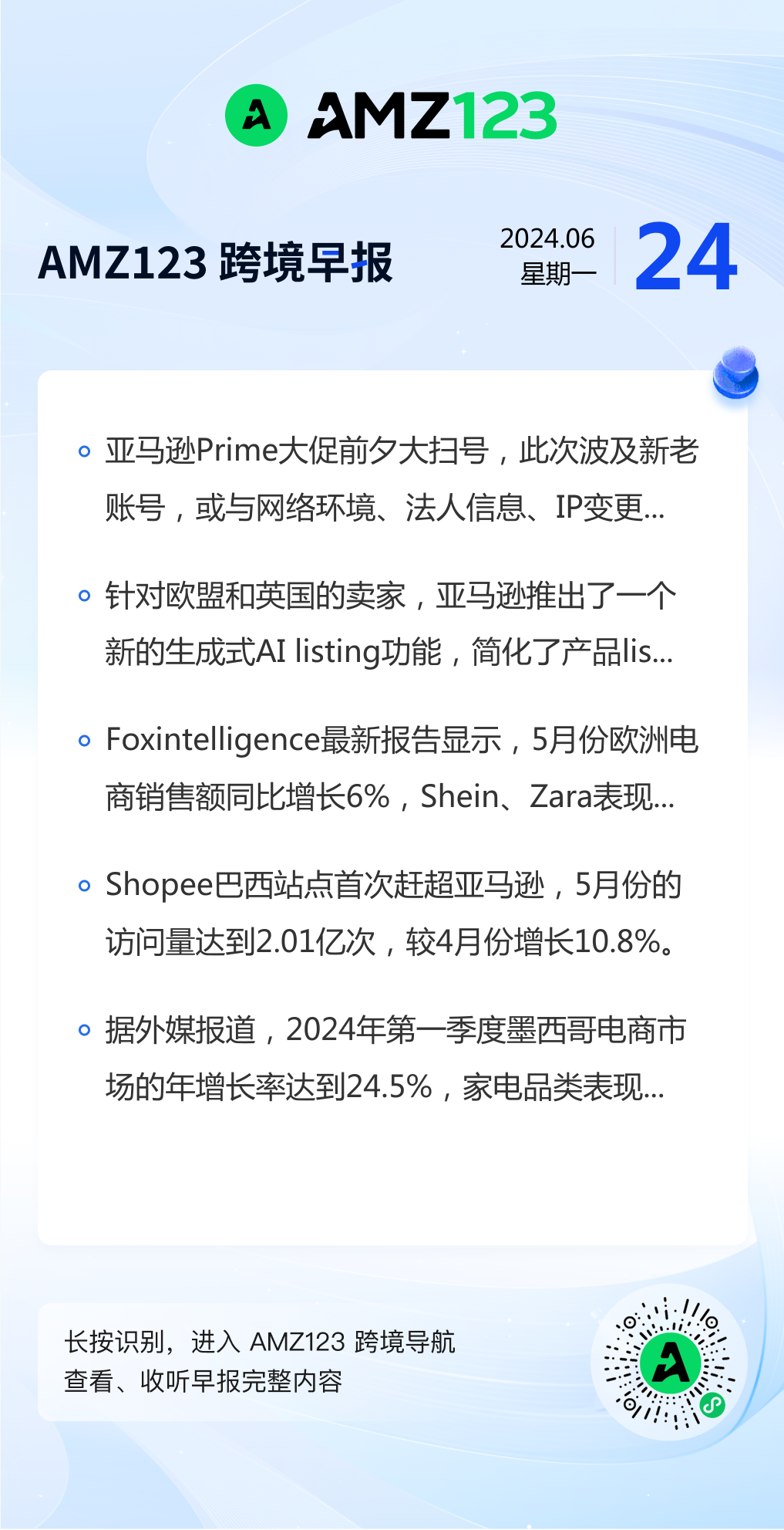 Foxintelligence最新报告显示,5月份欧洲电商销售额同比增长6%,Shein、Zara表现亮眼。
