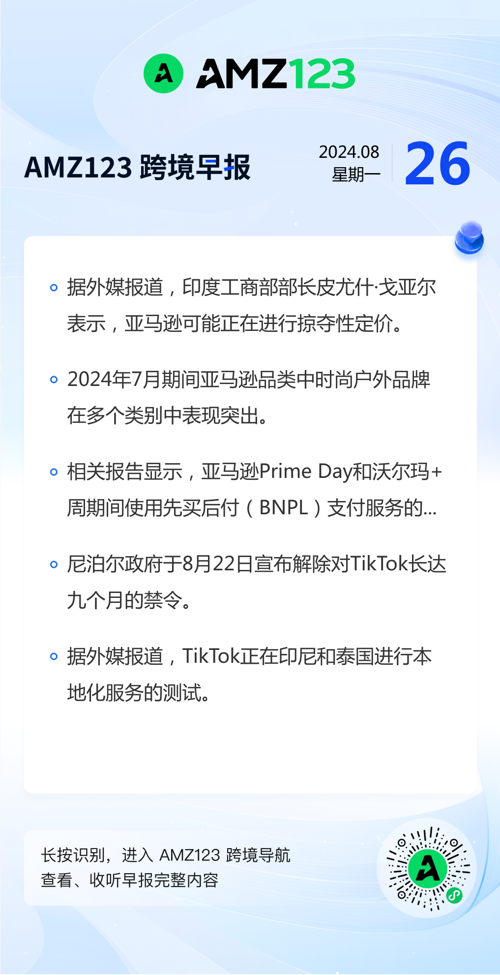 AMZ123获悉,近日,据外媒报道,印度工商部部长皮尤什·戈亚尔表示,亚马逊可能正在进行掠夺性定价。据悉,戈亚尔提到亚马逊在印度损失了 600 亿卢比,暗示该公司可能存在掠夺性定价。此外,戈亚尔认为,亚马逊宣布在印度进行大规模投资,不会用于优质服务或支持印度经济的重大投资,而主要是为了弥补他们所遭受的巨额损失。亚马逊对此表示:“目前我们对此事不予置评。