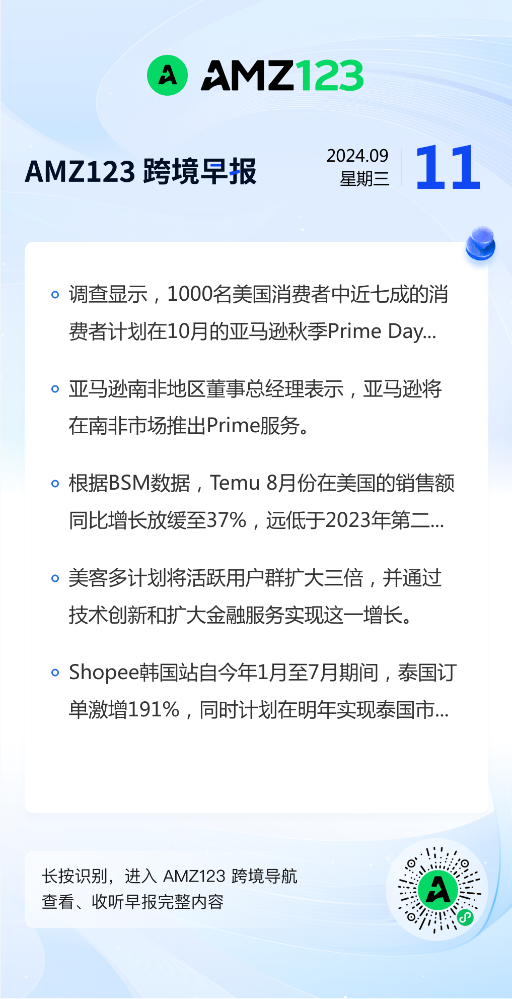 调查显示,1000名美国消费者中近七成的消费者计划在10月的亚马逊秋季Prime Day期间购买节日礼物。