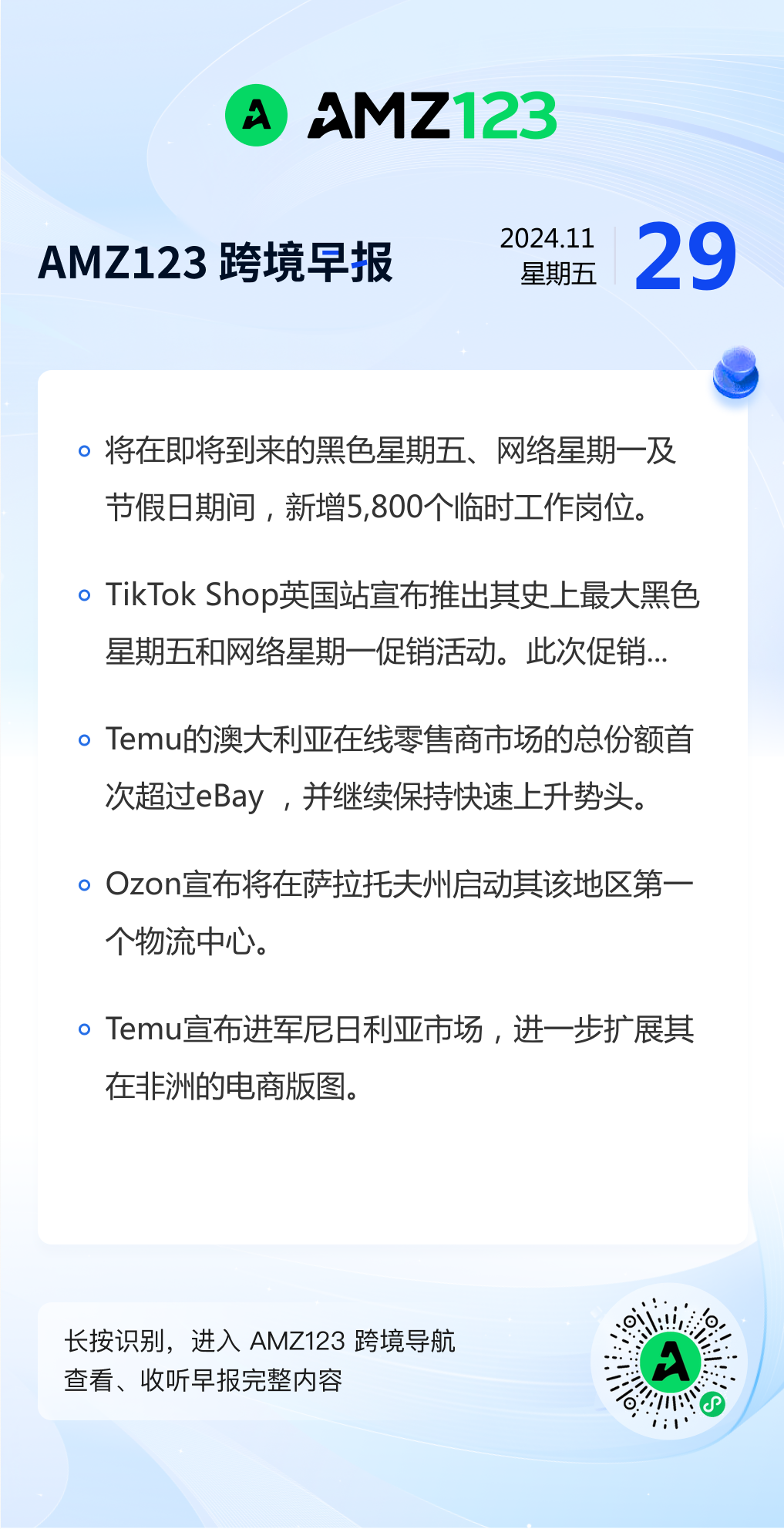 将在即将到来的黑色星期五、网络星期一及节假日期间,新增5,800个临时工作岗位。