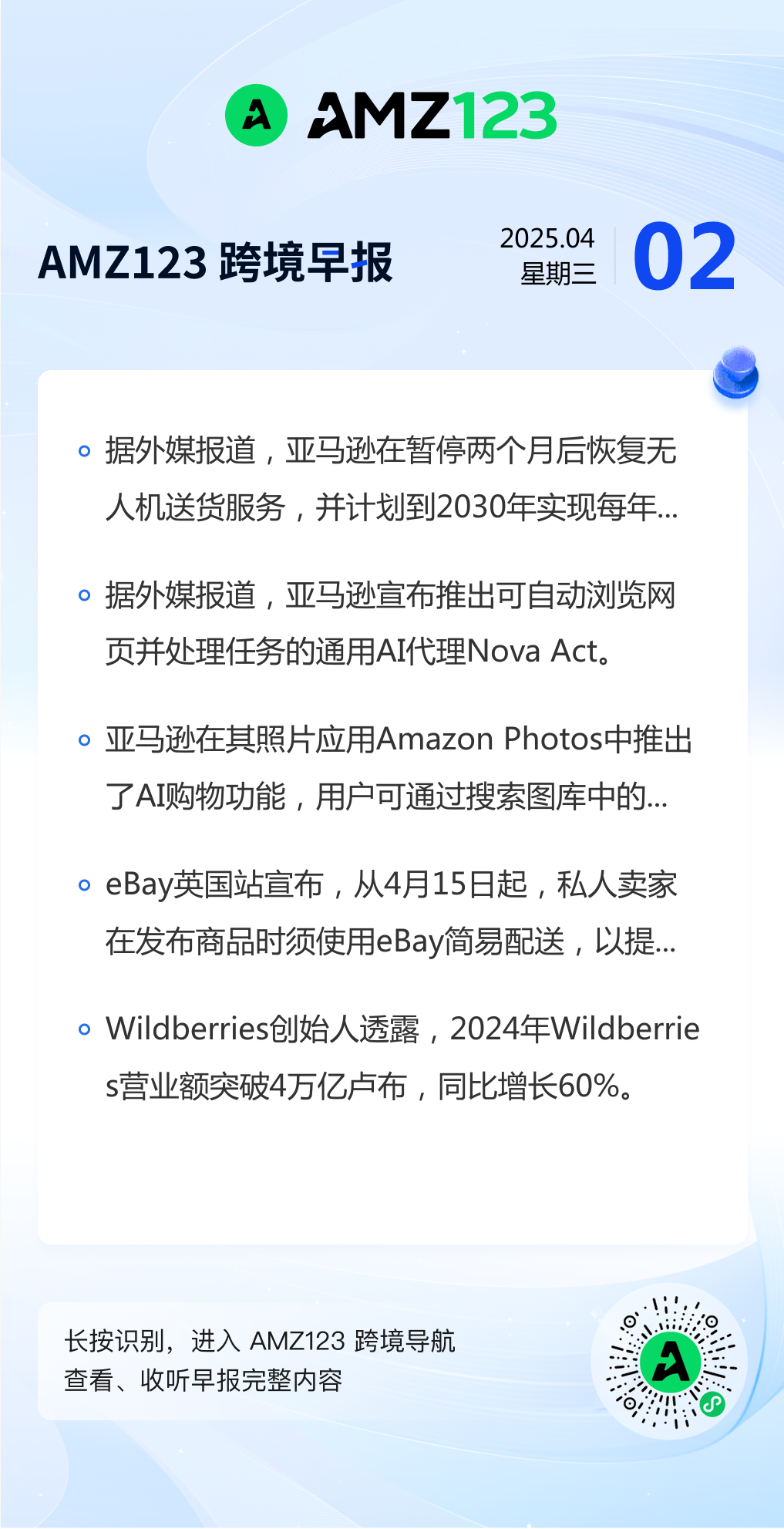据外媒报道,亚马逊在暂停两个月后恢复无人机送货服务,并计划到2030年实现每年交付5亿个包裹。