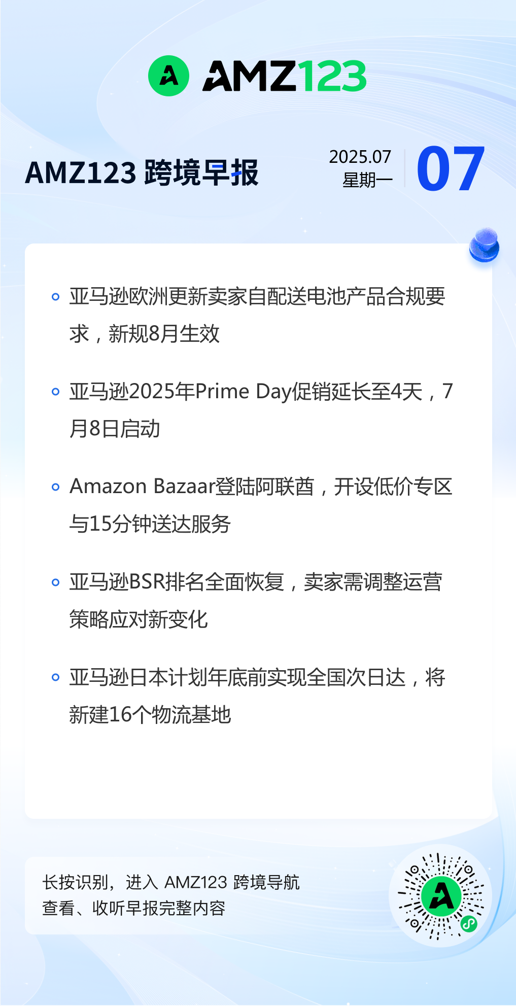 查看更多 亚马逊欧洲更新卖家自配送电池产品合规要求/亚马逊2025年Prime Day促销延长至4天/Amazon Bazaar登陆阿联酋