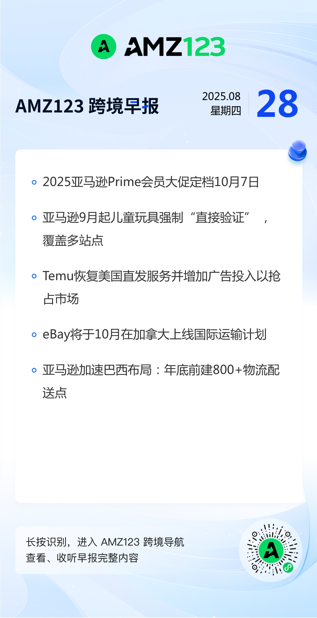 AMZ123获悉,近日,亚马逊宣布自2025年9月起,将针对儿童玩具类目强制实施“直接验证”(Direct Validation)制度。此举旨在进一步加强对儿童玩具产品的监管,确保平台上相关产品符合安全与质量标准。根据新规,卖家必须通过亚马逊认可的检测、检验和认证机构(TIC)完成产品合规验证。该制度适用范围广泛,涵盖美国、加拿大、英国及欧盟8国站点。同时,该验证结果将由机构直接提交给亚马逊,这意味着传统的卖家自行上传合规报告模式不再适用。为帮助卖家应对这一变化,亚马逊将提供相应的应对指引,卖家可自行通过账户状况面板查看受影响的ASIN,并根据自身情况选择服务商进行验证。