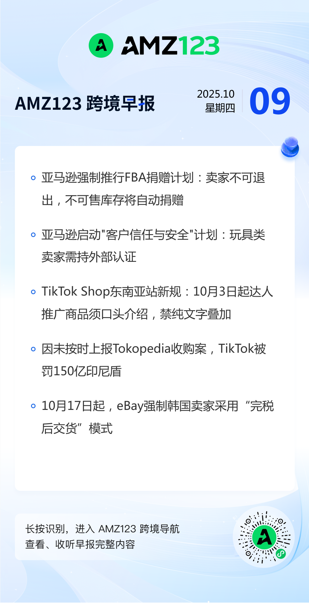 查看更多 亚马逊强制推行FBA捐赠计划:卖家不可退出,不可售库存将自动捐赠10月9日 周四《AMZ123》>>>跨境早报60秒 知晓跨境电商大小事情!