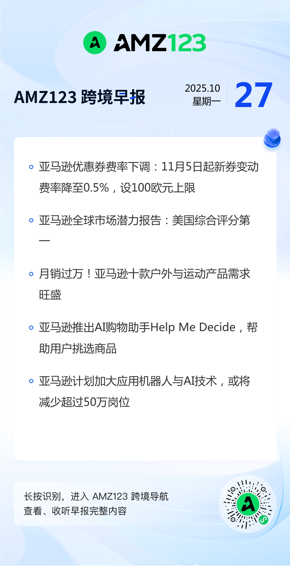 亚马逊优惠券费率下调:11月5日起新券变动费率降至0.5%,设100欧元上限