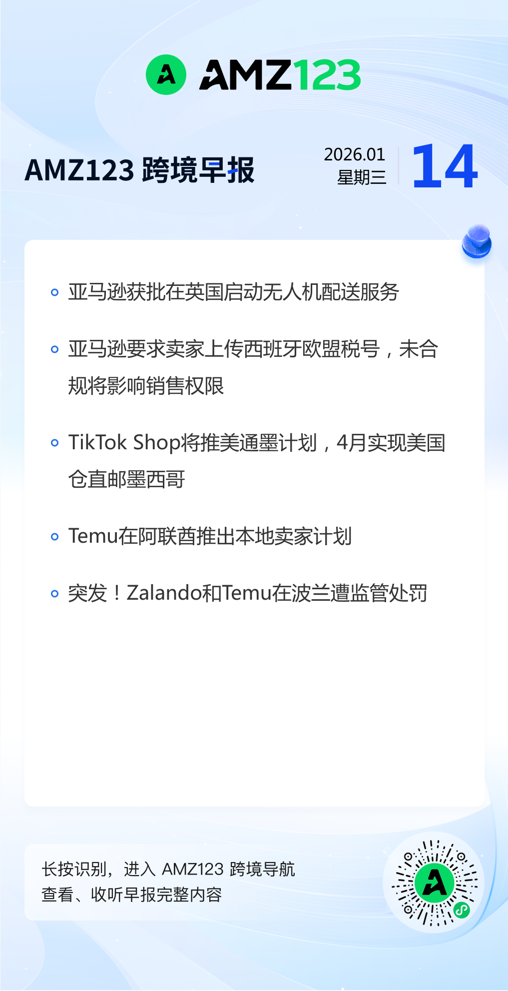 AMZ123获悉,近日,亚马逊已获得英国民航局(Civil Aviation Authority,CAA)批准,将在英国启动无人机包裹配送服务,成为该亚马逊在英国推进无人机商业化配送的重要一步。根据亚马逊披露的信息,亚马逊已于2026年1月9日获得开展无人机配送飞行所需的相关认证和许可,具备立即启动运营的条件,但具体的首批“实飞”时间尚未公布。此次获批意味着亚马逊可在英国开展白天、当日达的无人机包裹配送服务。首个运营区域计划设在英格兰东北部达勒姆郡达灵顿镇周边,亚马逊将从当地的一处仓库起飞无人机执行配送任务。根据规划,该站点预计每小时最多可执行10次飞行,每天运行12小时,每周7天不间断运作。
